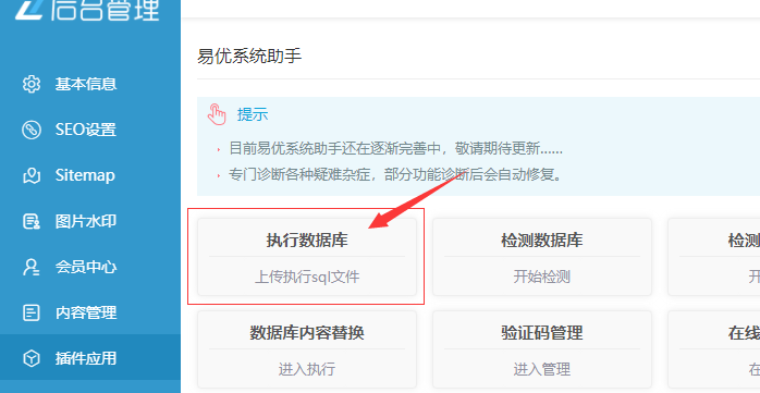 如果沒有不懂用工具,可以下載sql壓縮包,解壓將里面的sql文件,在【易優(yōu)系統(tǒng)助手】插件里執(zhí)行。
