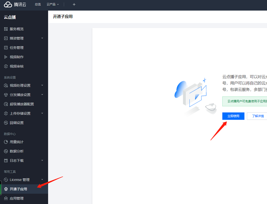 4. 開通云點播子應(yīng)用,選擇左側(cè)倒數(shù)第二個選項開通子應(yīng)用,然后點擊立即使用進(jìn)行開通