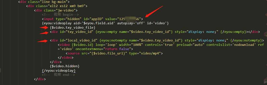 (2).在代碼32行左右處找到<div class="jw-video">,將這 個DIV所包含的內(nèi)容全部清空,復(fù)制下述代碼放置于DIV內(nèi), 不建議改動這段代碼的判斷和ID,但格式、樣式可以自行調(diào) 整,不會影響功能,標(biāo)紅處為云點播重點,不想全部復(fù)制的, 可自行單獨復(fù)制放置對應(yīng)位置
